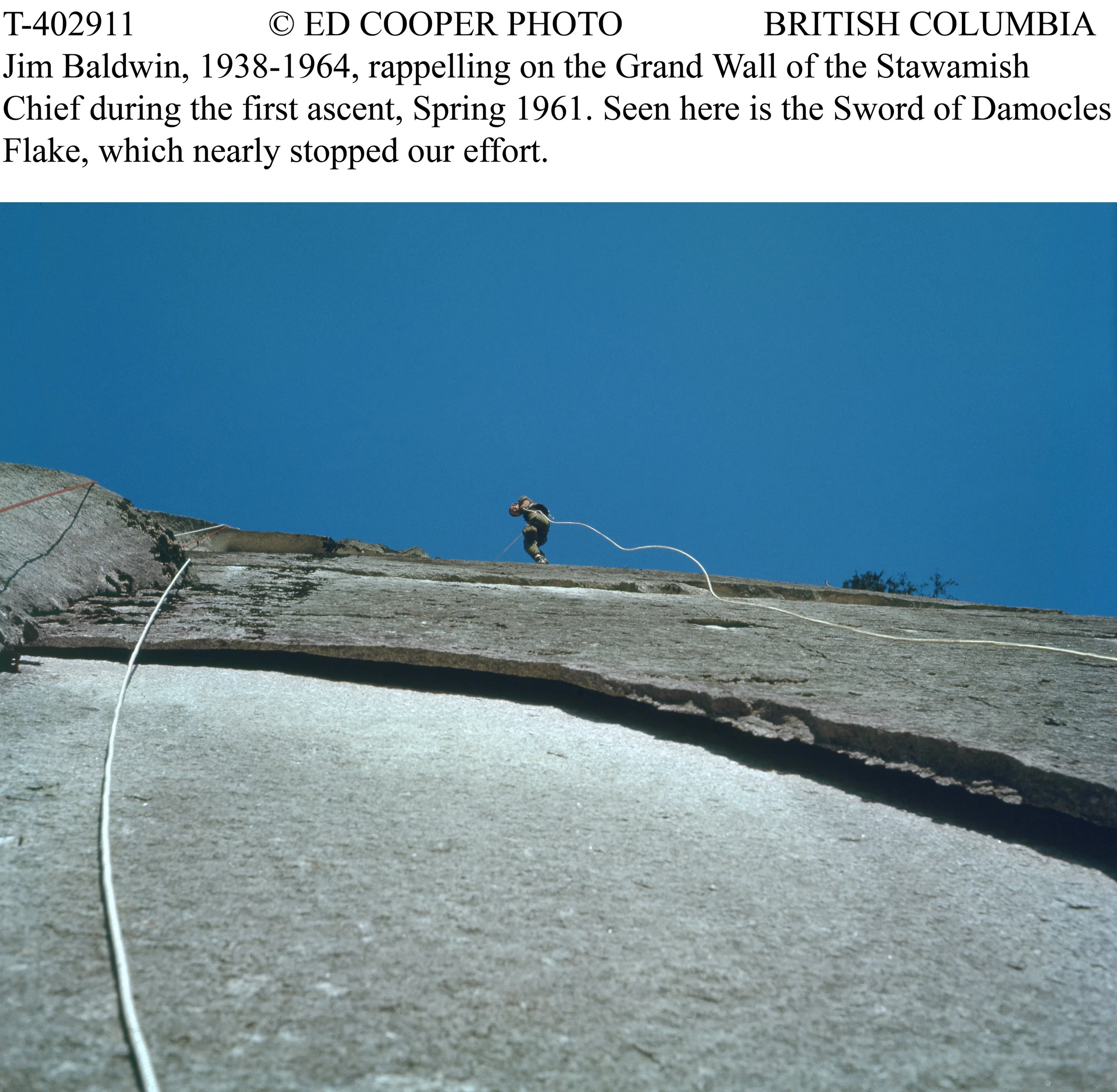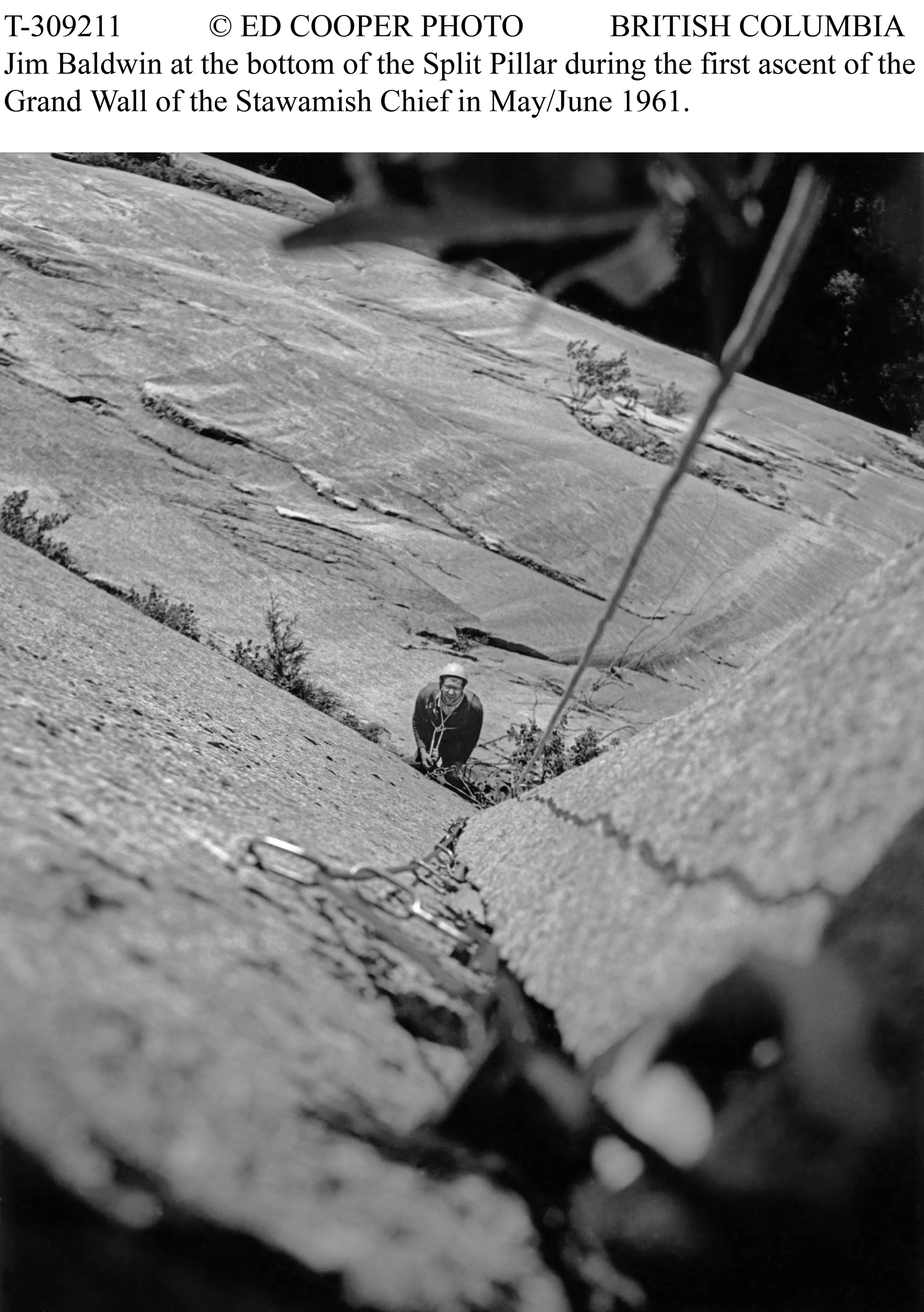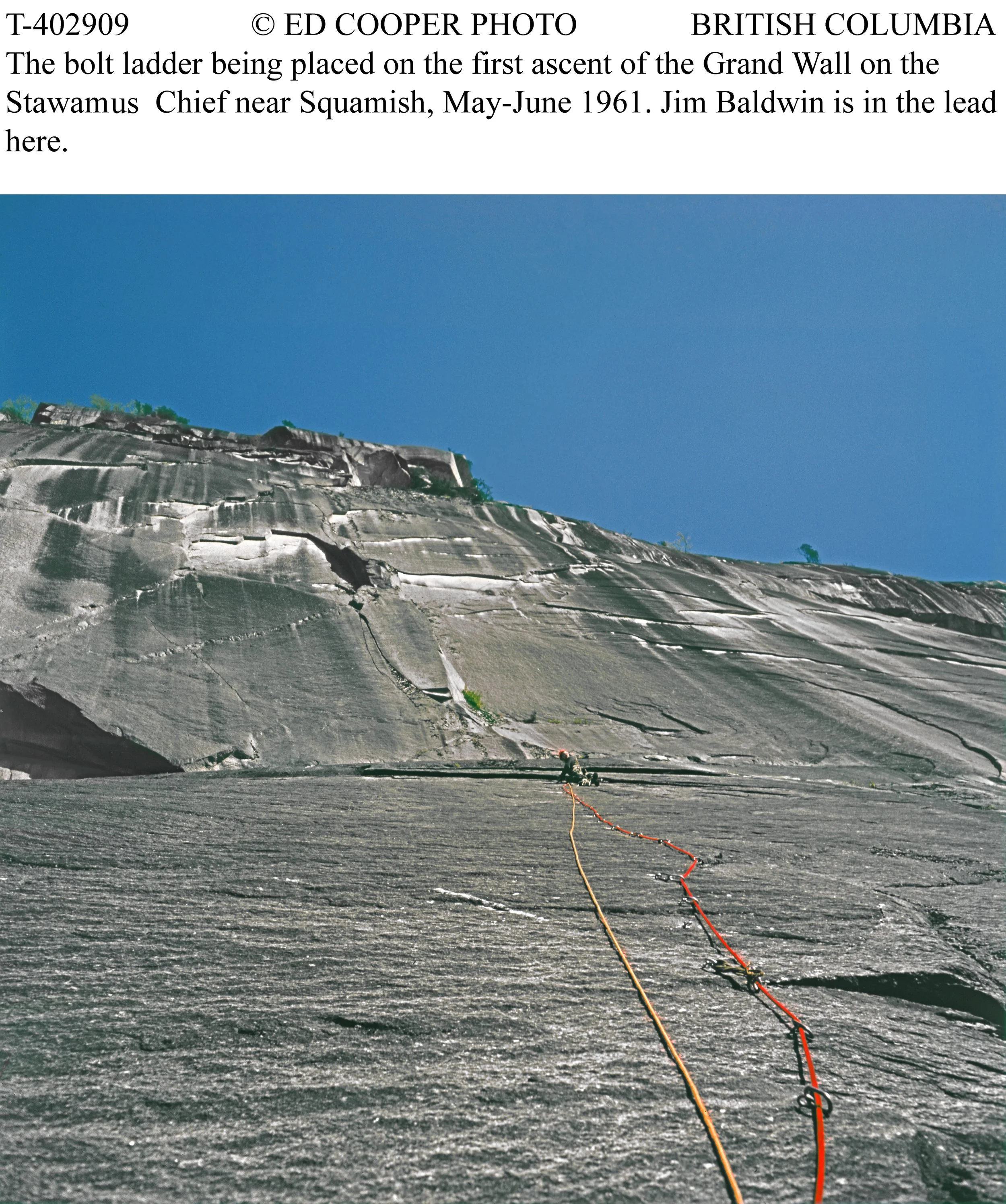 In 1961, Ed Cooper and Jim Baldwin completed the first ascent of the Grand Wall on the Squamish Chief. They ascended fixed ropes using Prussik knots, hammered in wood pitons, and drilled and placed many ¼” bolts. The community supported the effort by providing accommodation and welding together stronger steel pitons.