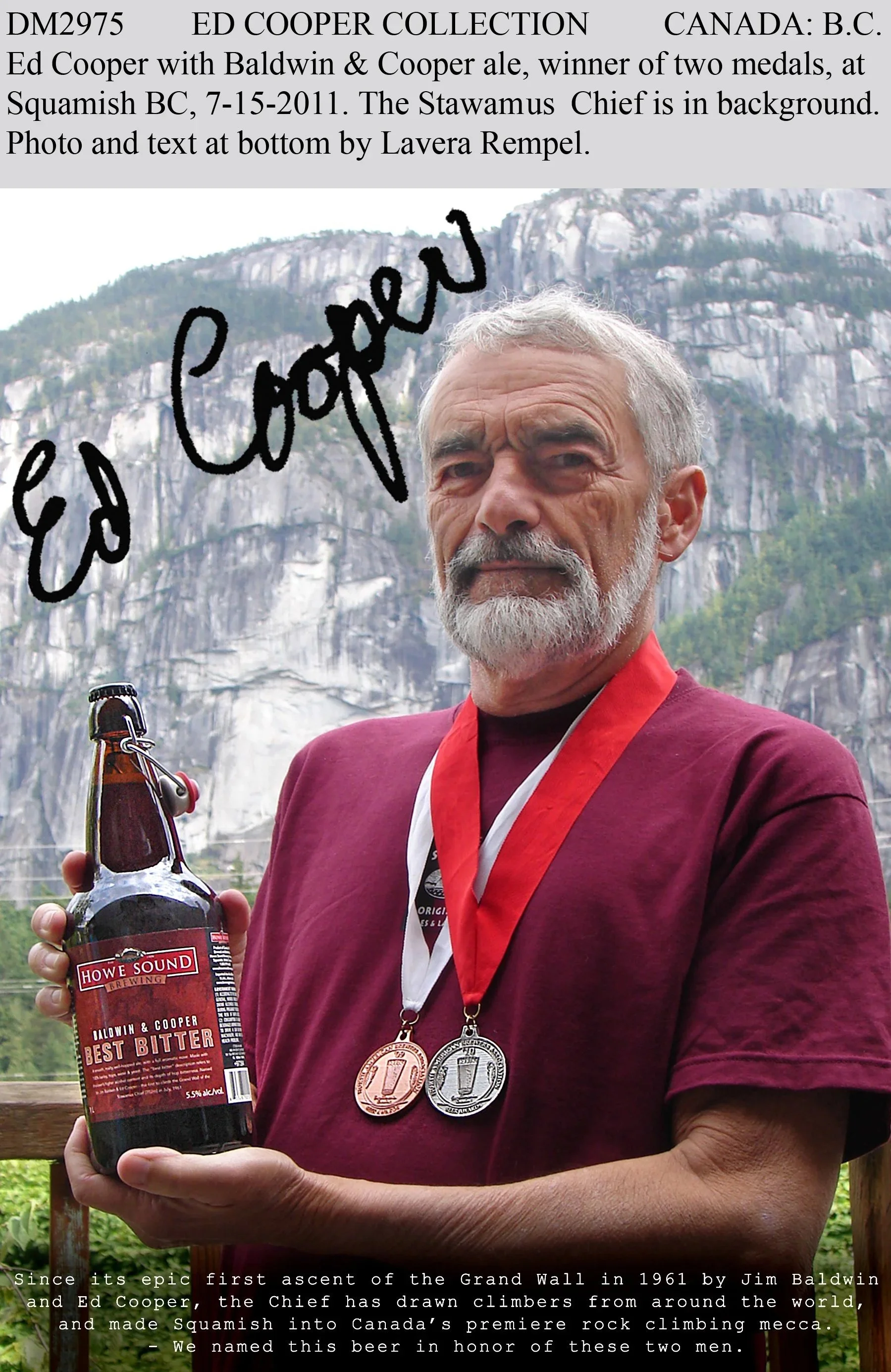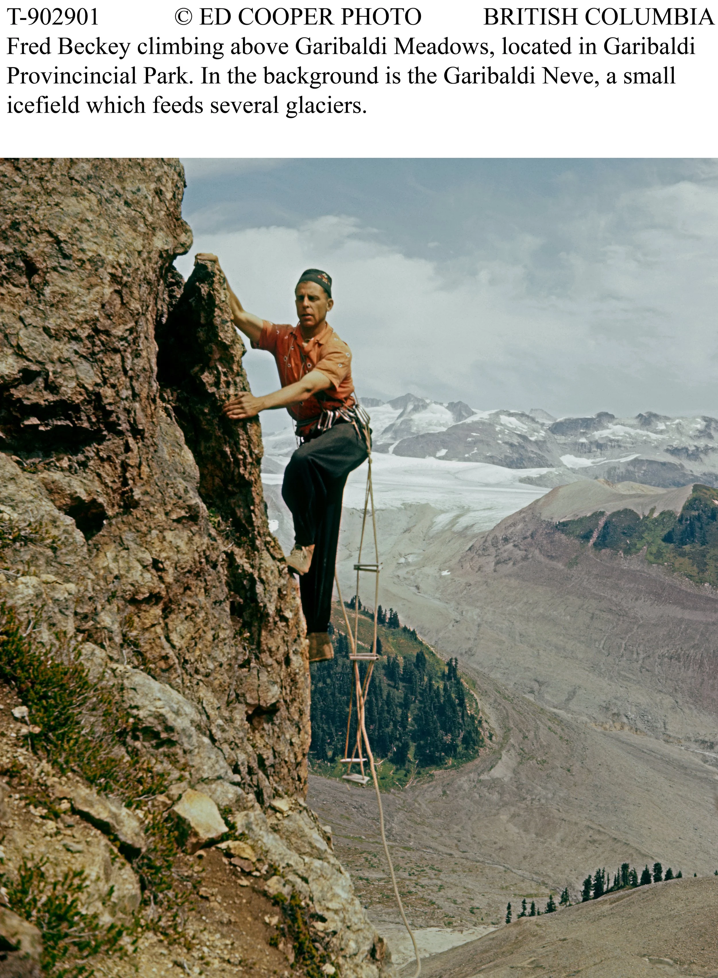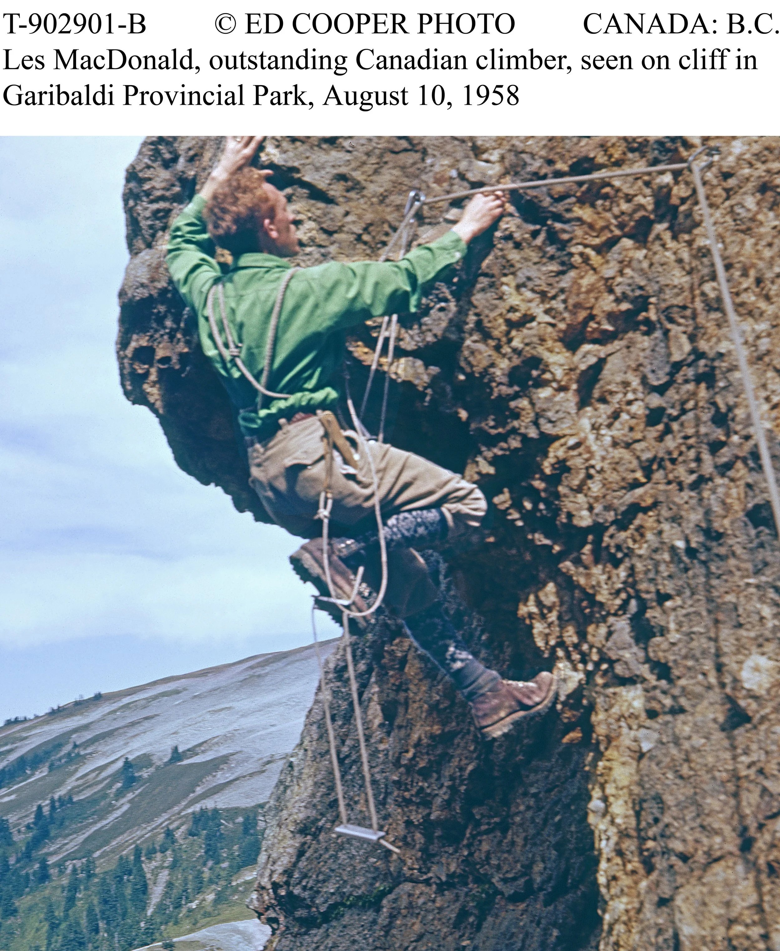 In 1961, Ed Cooper and Jim Baldwin completed the first ascent of the Grand Wall on the Squamish Chief. They ascended fixed ropes using Prussik knots, hammered in wood pitons, and drilled and placed many ¼” bolts. The community supported the effort by providing accommodation and welding together stronger steel pitons.