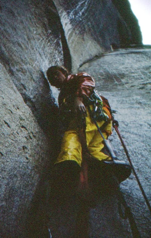 Peder Ourom climbing the last pitches of the Shield Wall in icy water. El Capitan, Yosemite, California. 1979