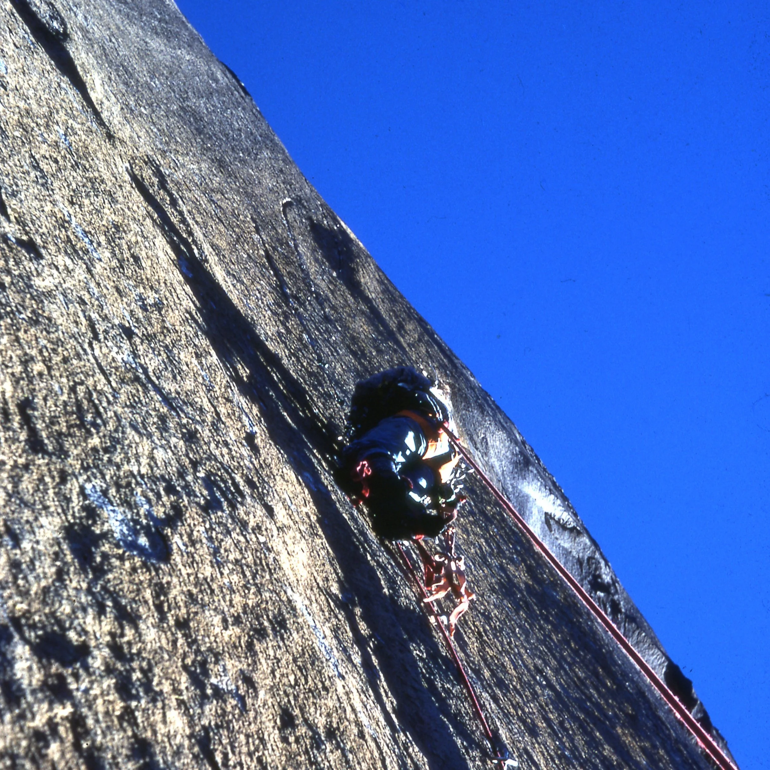 Paul Bernsten climbs the Shield Wall, El Capitan, Yosemite, California, 1979.